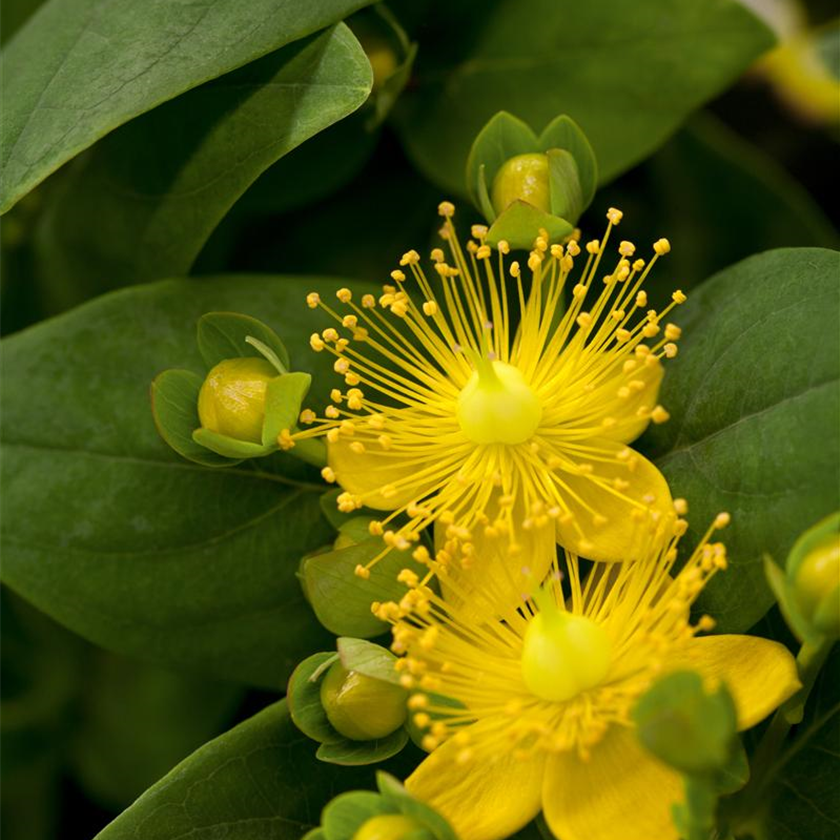 Das Gartenjahr wird bunt. Dafür sorgt Johanniskraut 'Magical' mit Leichtigkeit. Im Sommer sind es die leuchtend gelben Blüten, die das Auge erfüllen und im Herbst werden Sie sich an den roten Früchten nicht satt sehen können. Auch für eine Heckenbepflanzung ist dieser kompakte Strauch gut geeignet. Die Zweige sind ein beliebter Vasenschmuck, der besonders um die Weihnachtszeit stimmungsvolle Akzente setzt. Das Johanniskraut 'Magical' benötigt einen durchlässigen Gartenboden und gedeiht in Sonne und Halbschatten.