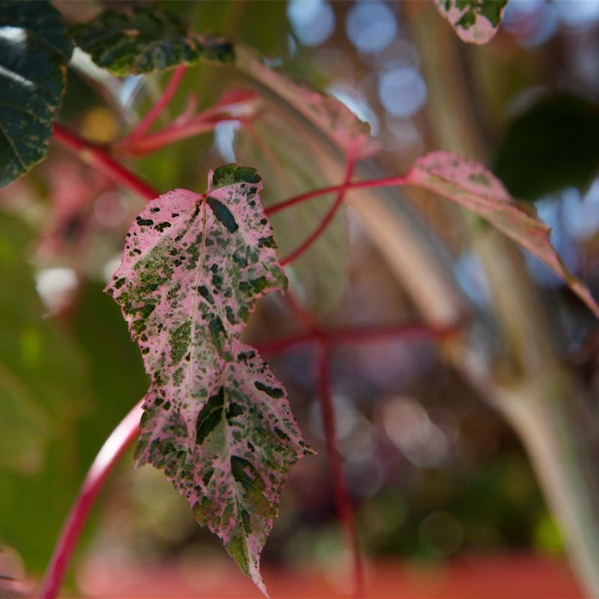 Der Strauchahorn 'Red Flamingo' (Acer conspicuum) zeichnet sich durch seine mehrfarbige Blattfarbe aus. Dieses aufrecht, strauchartig wachsende Laubgehölz erreicht eine Höhe von ca. 5 m und eine Breite von ca. 1,5 m. Der Strauchahorn 'Red Flamingo' ist gut frostverträglich.